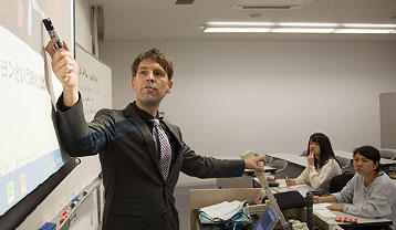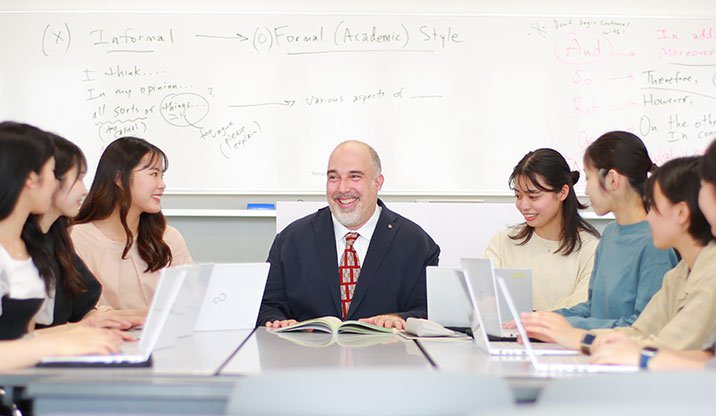 現在は、准教授として福岡県北九州市にある九州国際大学法学部に所属し、一般教養の英語と中・高の英語の教員免許取得を目指す学生を対象とした英語科教育法という科目を担当しています。授業以外では、オープンキャンパスで学部紹介を行ったり、個人ブースで参加者(高校生とその保護者の方々)からの質問に答えたりすることもあります。