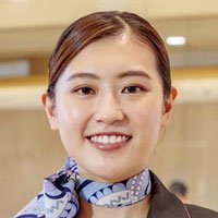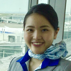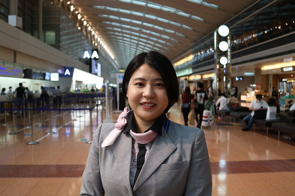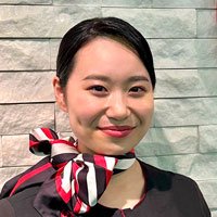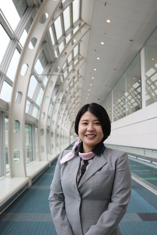 わたしは、客室乗務員(CA)として、国内線・国際線共に乗務しています。現在はコロナ禍で乗務する機会は少ない状況ですが、今年に入り、国内線チーフパーサーと国際線パーサーの資格取得のための訓練を終えました。これまで先輩から多くの事を教わってきましたが、次は自身がマネジメント層として後輩に伝えていく立場になるため、日々精進していく所存です。