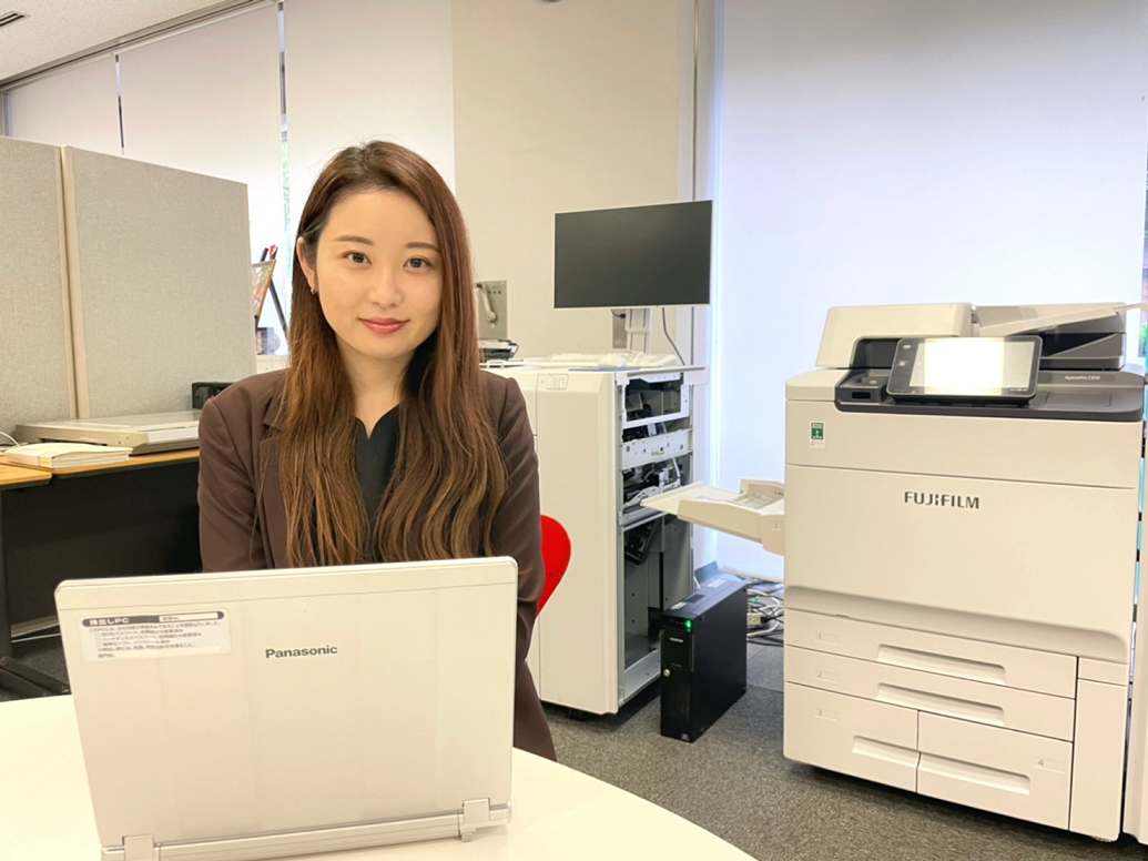 私は複合機を含むITツールを活用した業務改善など、お客様が働きやすい環境を構築する業務に携わっています。複合機やパソコンなどをお使いいただいている法人のお客様に、日々の業務についてヒアリングし、お客様に最適なソリューションを提案することが、営業としてのミッションです。知識はもちろんですが、お客様と対話し交渉する能力も必要となります。自分の提案した内容がお客様に認められ、感謝の言葉を頂いた時が一番嬉しく、自分の成長を実感できる事が営業職の魅力です。