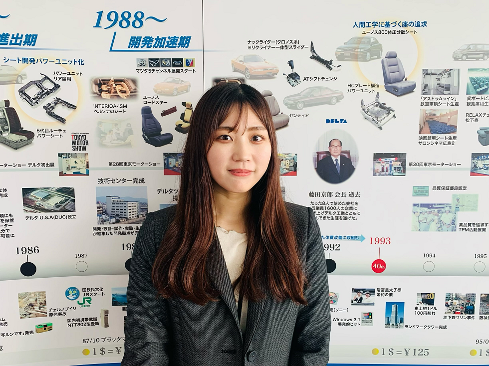 デルタ工業では、業務に生かせる英語力の育成・向上のために、社内でTOEIC®を受験したり、就業時間内に語学研修を受けたりすることができます。そのおかげもあり、TOEIC®のスコアは在学中の865点から、現在は915点まで伸びました。また、社内には英語英米文学科の先輩方や後輩も多く働いています。同じ学科の卒業生という共通点のおかげで、プライベートでも仲が良く、一緒に安田を訪問したりしています。このように、大学での学びや人間関係を保ちつつ向上していける現在の仕事は、とても充実しています。